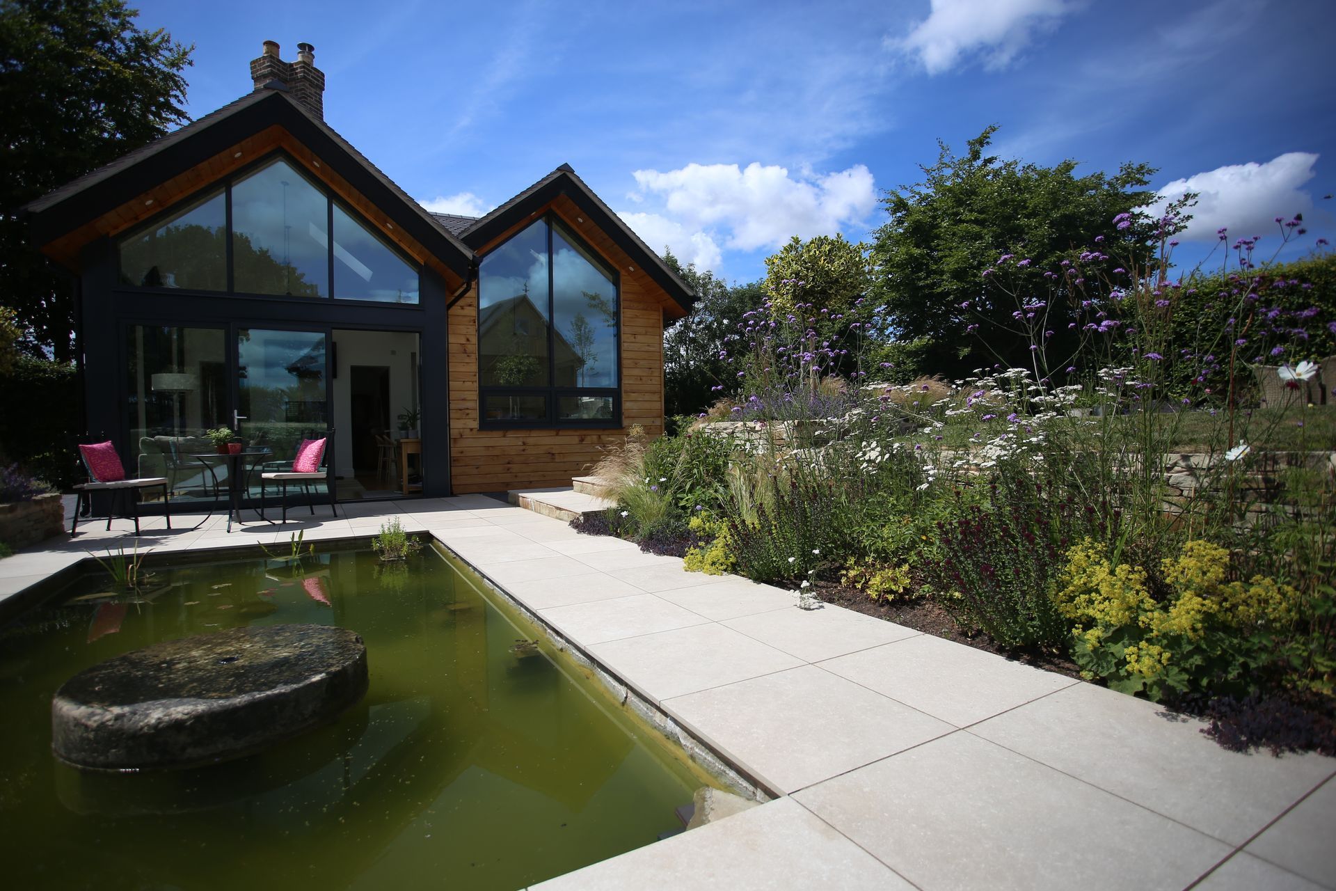As the substantial-sized pond in the garden creates a wonderful anchor point when viewed through the large glass doors, the addition of some soft and naturalistic planting helped to complete the desired effect.
